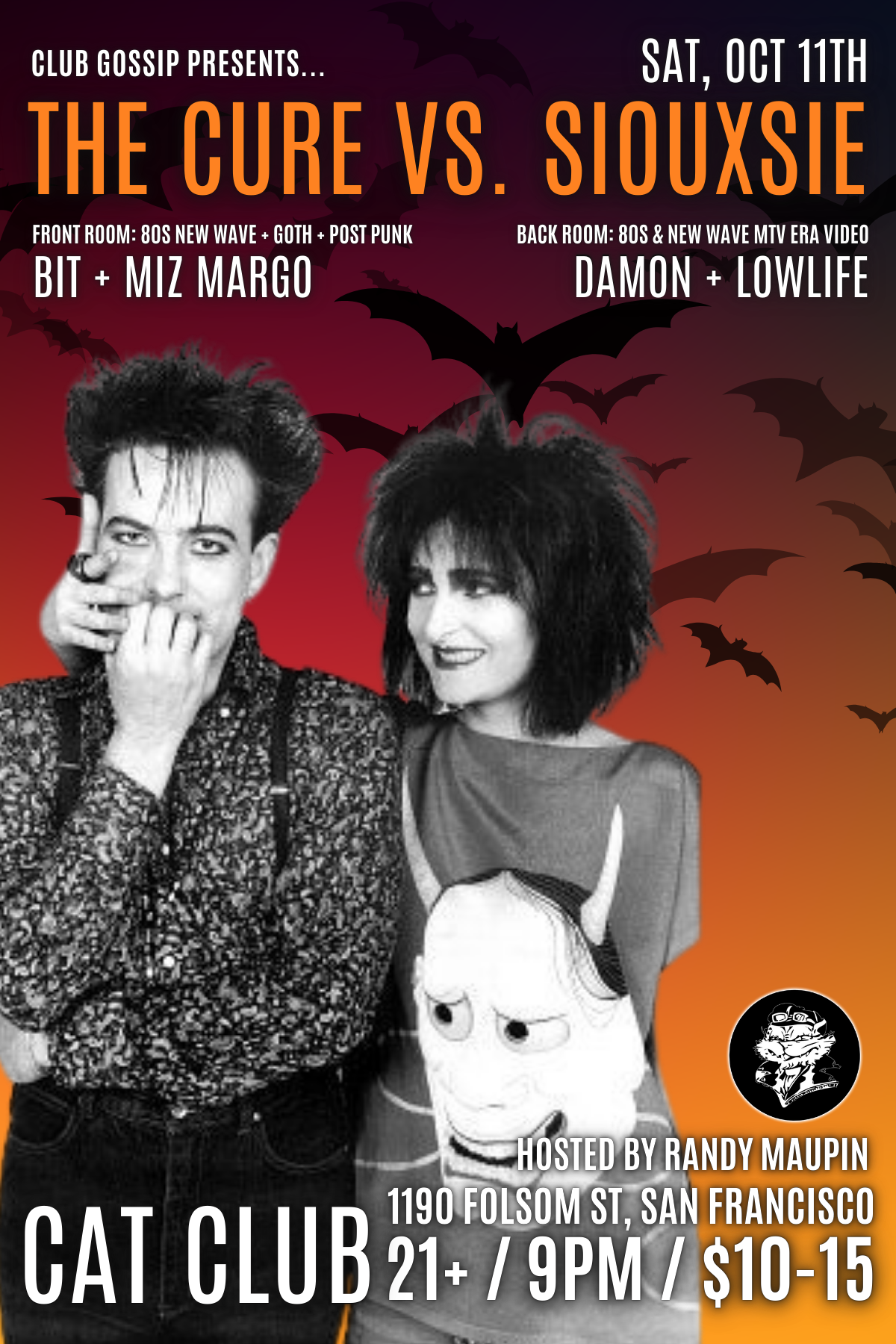 October is here, fall into being your best spooky self and let’s listen and dance to The Cure & Siouxsie and the Banshees all night long, and everything we love, like Joy Division, New Order, David Bowie, Kate Bush, Blondie, Cyndi Lauper, Pet Shop Boys, Erasure, Q Lazzarus, Echo & the Bunnymen, OMD, Eurythmics, INXS, Prince, Duran Duran and Depeche Mode, Saturday October 11th at Cat Club. We love these bands, join in the fun as we listen, dance and watch classic video of the punk, post-punk, goth, pop, rock and new wave era of the 70's & 80's.