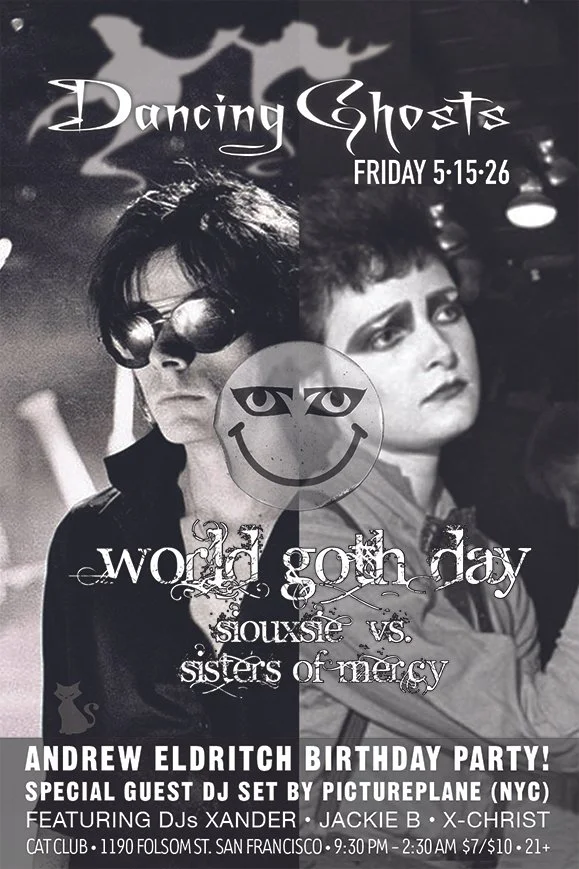 Join Dancing Ghosts, SF’s Darkwave Dance Party, for our 17th annual World Goth Day party! This year's events falls on the birthday of goth icon ANDREW ELDRITCH, and just before the birthday of SIOUXSIE SIOUX!